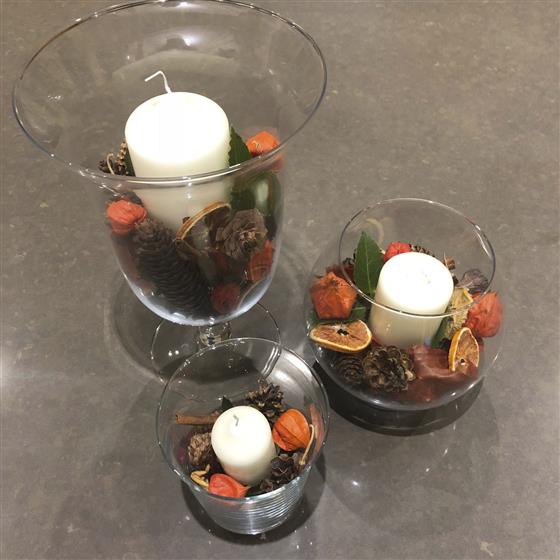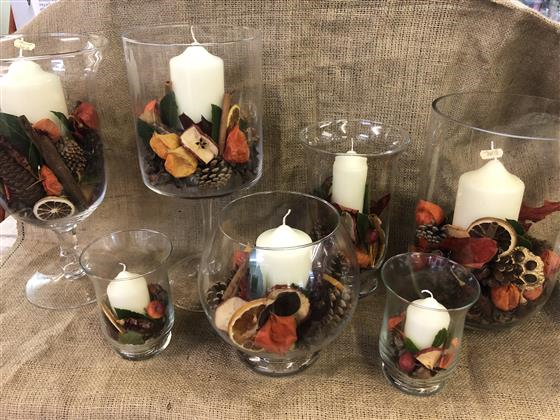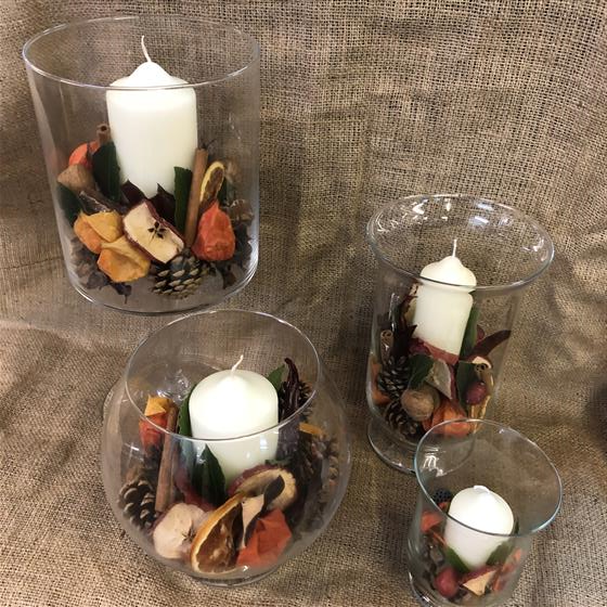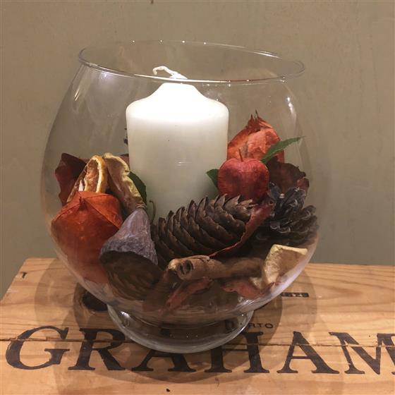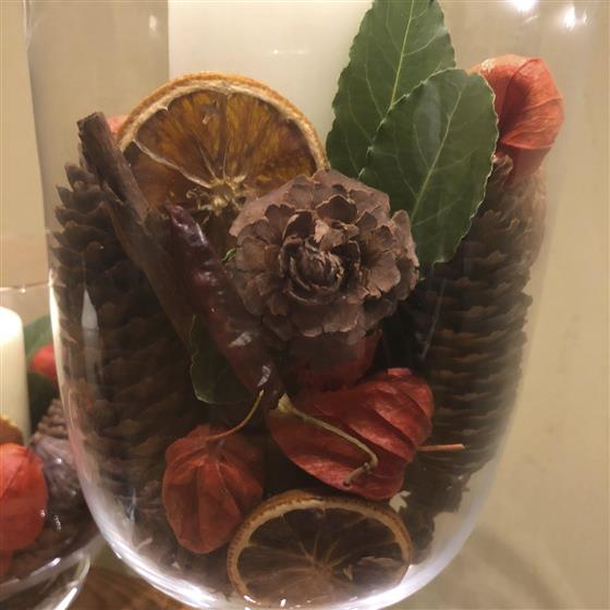 Glass vase with a cream church candle, surrounded by natural selection of dried physalis heads, cinnamon, dried fruits, pods & cones Delivery within Leeds area only.