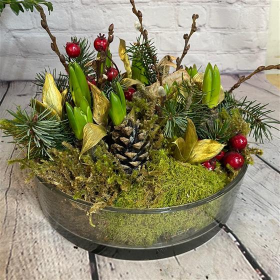 Shallow glass fish filled with hyacinths, decorated with moss, winter foliage, pine cones, berries & hints of gold