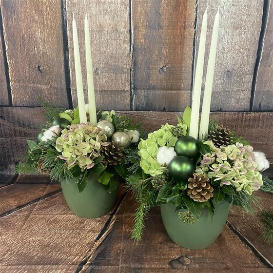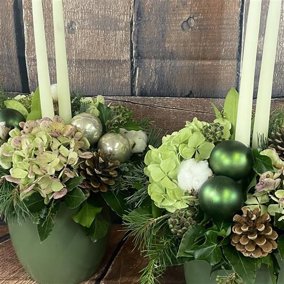 A matt green ceramic, filled with festive foliages, hydrangea, baubles & cones, all nestled around some tall tapered candles.