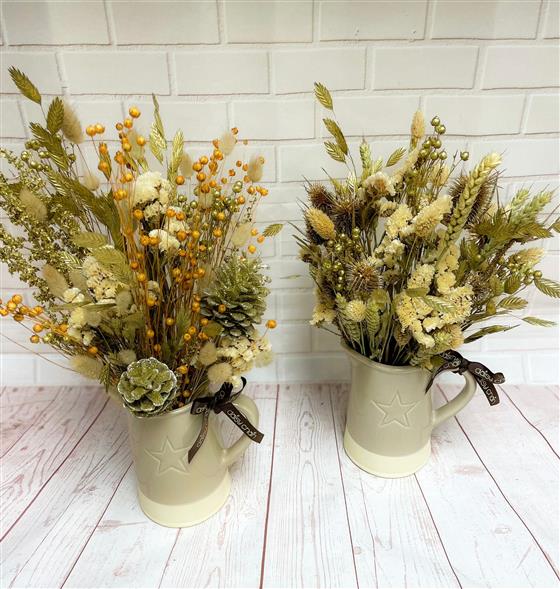 Lovely quality ceramic jug with embossed star, filled with muted dried flowers with a festive touches. Each one is unique, it may have hints of gold or bronze or include pine cones