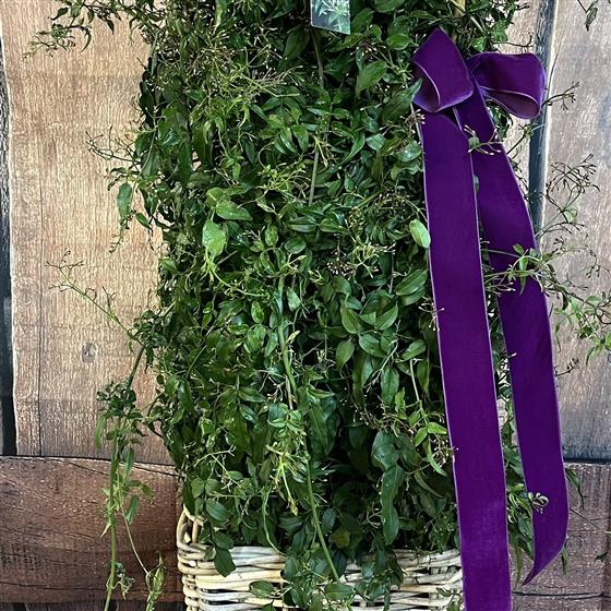 Huge jasmine plants in a gorgous tall square wicker basket and finished with a luxe velvet bow.