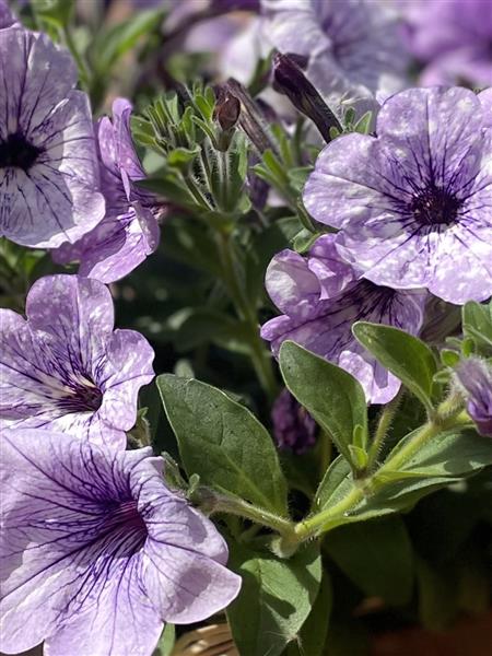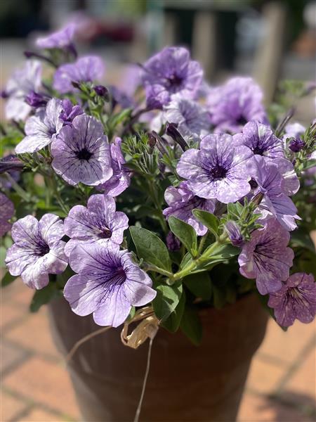 Gorgeous patio planter with unusual mottled lilac petunia.