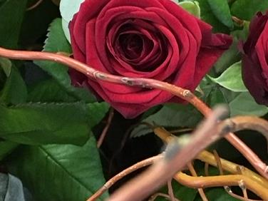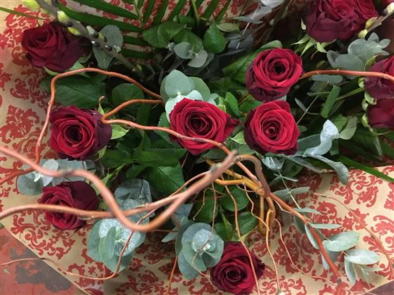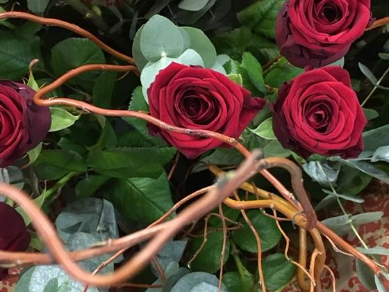 Long stemmed, large headed roses. Arranged with eucalyptus, pussy willow, twisted willow and palms.
